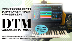 熊本を中心に日本全国を対象にご自宅でZOOMまたはMicrosoft Teamsを使ったオンライン形式でデスク・トップ・ミュージック(DTM)が学べる音楽教室です。また熊本市内の指定会場にて対面でのレッスンもOKです。パソコンで音楽を楽しむための、基本操作と知識を習得できる初心者向け教室で音楽制作ソフトの使い方を中心に、楽曲が出来上がるまでの流れが学べます。