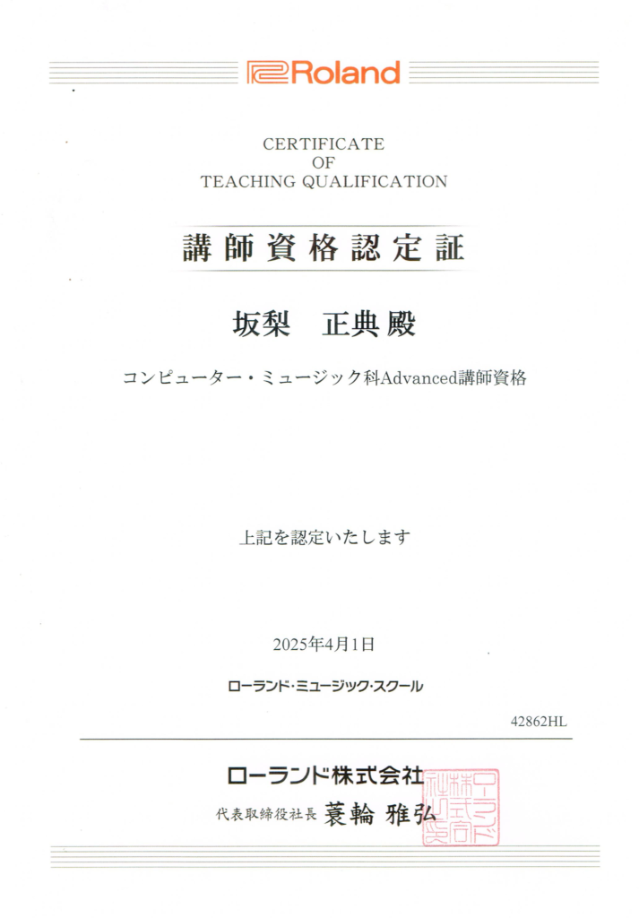 昨年の秋に、ローランド・ミュージック・スクール コンピューター・ミュージック科PCミュージック・アドバンスコース講師資格の認定試験を受けていましたが、無事に2025年4月1日付で認定証が届きました!