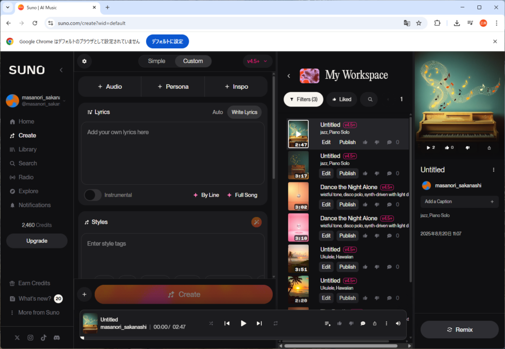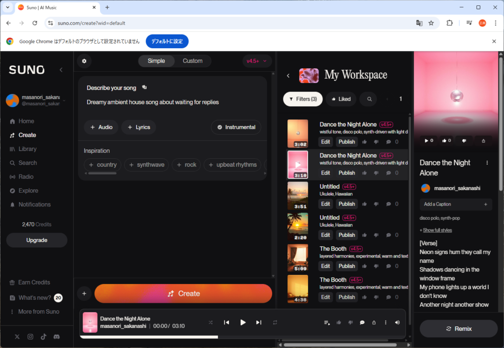 こちらは、どんな曲ができるかが運次第という感じがします。ただ、歌詞を直接入力したりStyle of Musicを指定することで、ある程度意図したものができる可能性が出てきます。
