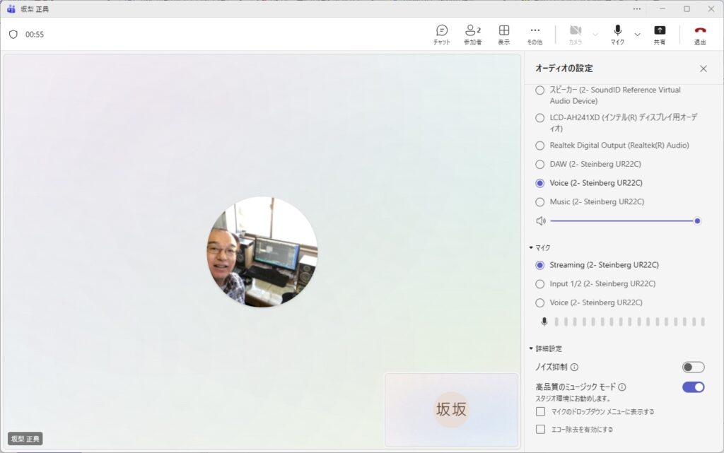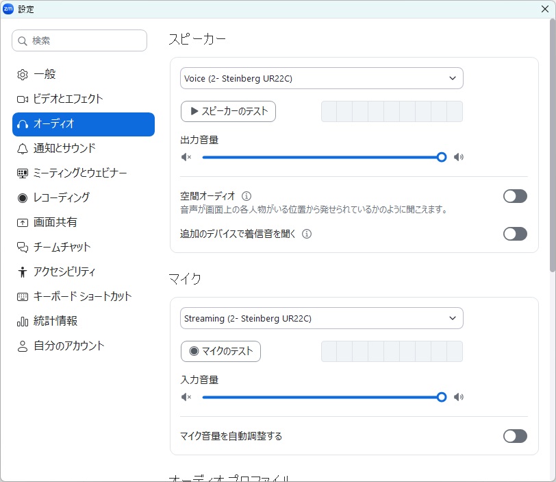 その下にあるマイクの設定は、「Streaming(Steinberg UR22C)」を選びます。ここには、UR22Cにつないだマイク音声とDAWからの出力音声、PCからの音声ファイル再生音が入力されて、相手先に届くようになります。