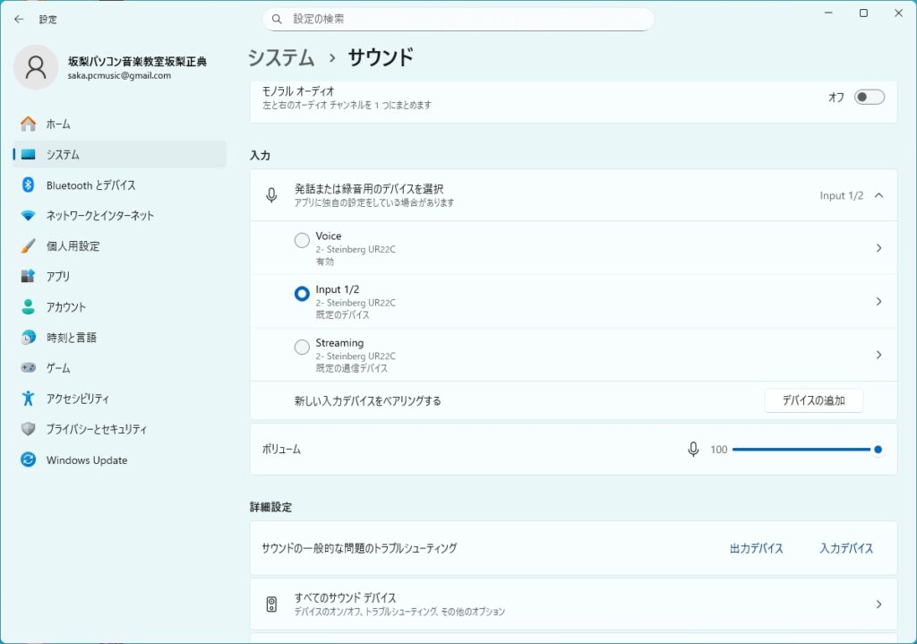 次にサウンドの入力ですが、「Steinberg UR22C Input 1/2」を選びます。そして、オーディオインターフェース「UR22C」の正面にあるINPUT1にマイクをつなぎます。コンデンサマイクを使用する場合は、ファンタム電源の+48Vをオンにします。これで「UR22C」につながったマイクからの音声信号がWindows側で認識されるようになります。