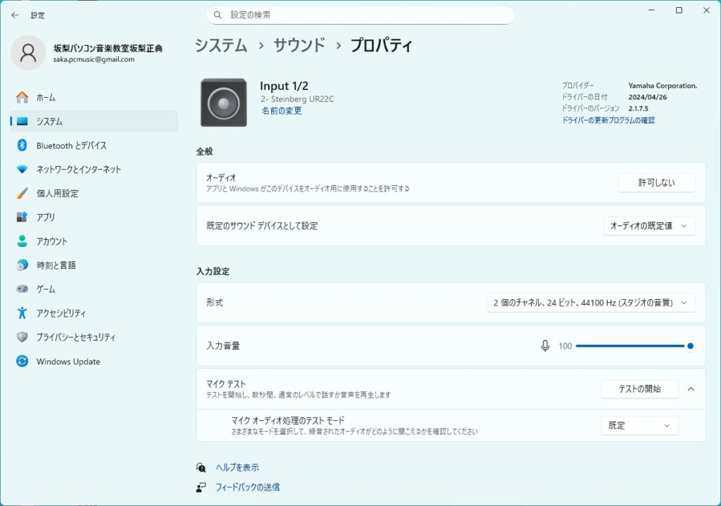 そして入力のプロパティも出力と同じく「2個のチャンネル、24ビット、44100Hz(スタジオの音質)」を選びます。これで音が出なくなるトラブルも起きにくくなります。