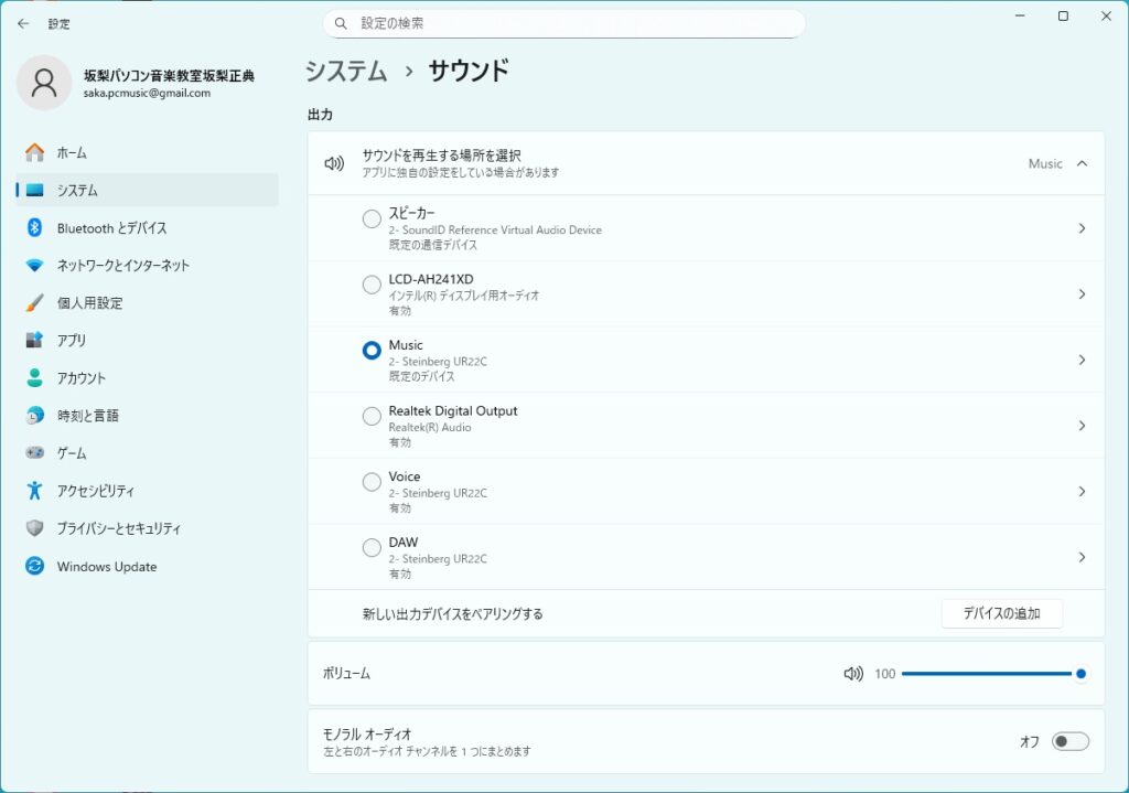 まず出力ですが、「Sreinberg UR22C Music」を選択します。これは、DAWソフトを経由しないYoutubeなどの音声や、PCにあるWAVファイルやMP3ファイルなどの音声ファイルの再生音がどこから出力されるかを決める部分になります。
