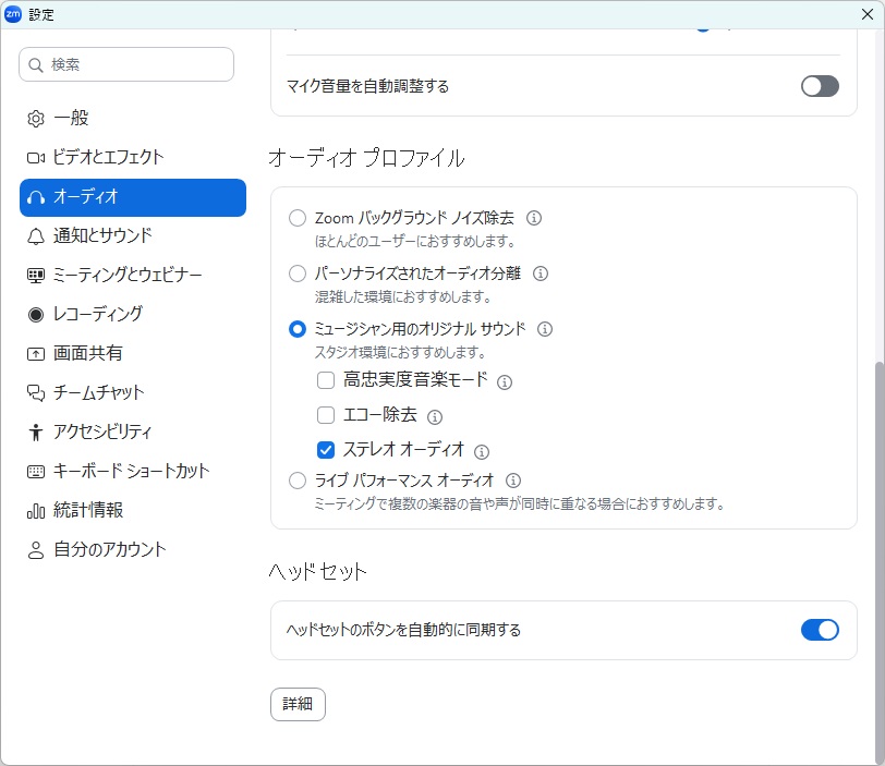マイク設定の下にあるオーディオプロファイルは、「ミュージシャン用のオリジナルサウンド」と「ステレオオーディオ」を選びます。「高忠実度音楽モード」については、Windows側のサウンド設定で44100Hzを選んでいるので、チェックを入れる必要はありません。もし通信量やPCの負荷が重くなっても問題なく、インターネット回線が安定していれば、Windows側のサウンド設定のプロパティを48000Hz/96000Hzに設定して、Zoom側の「高忠実度音楽モード」にチェックを入れても良いかと思います。