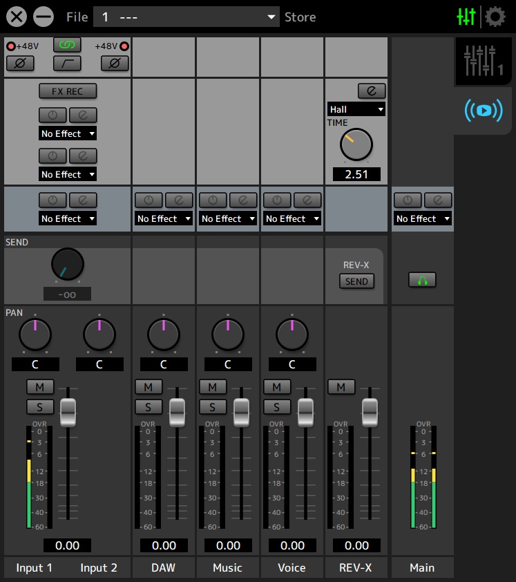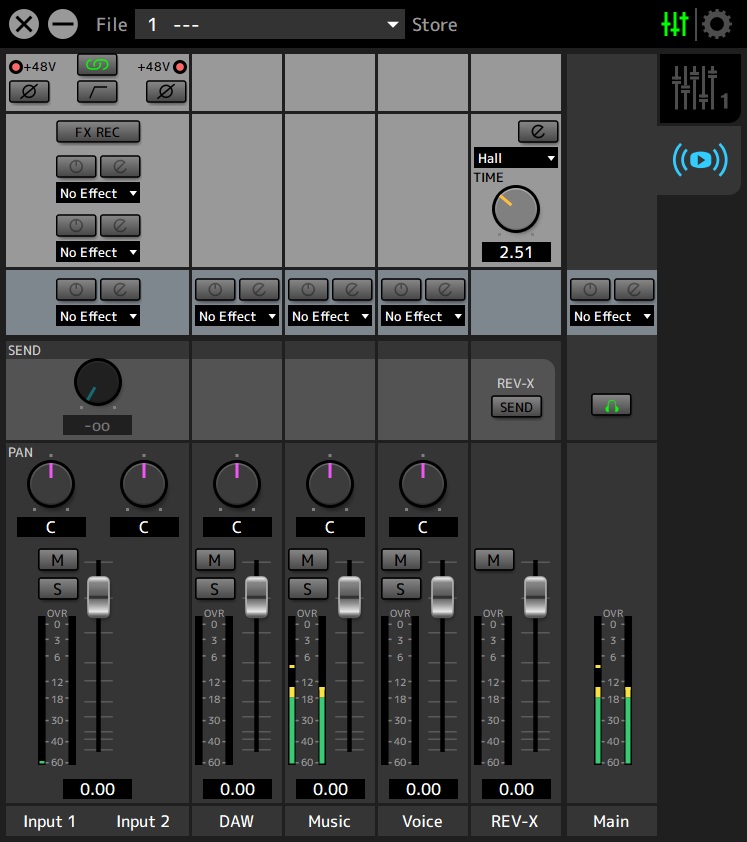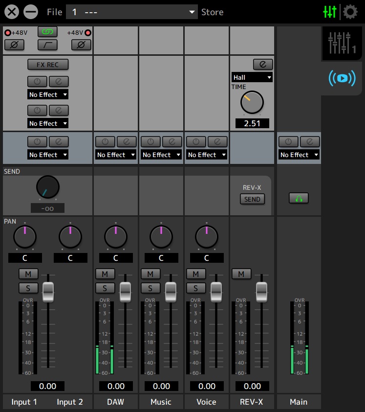 実際にこちらのマイク音声や、DAWからの音声、相手の先生からの音声が無事届いているかは、UR22Cに同梱している「dspMixFx」ソフトを起動する事で確認できるようになります。